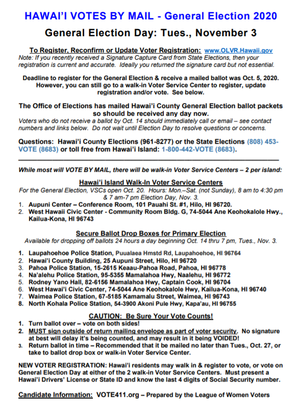 Most Hawai’i Voters have now received their General Election Ballots in the mail! This recaps what more you may need to know…and where to call if uncertain or you didn’t get a ballot. VOTE EARLY!!!